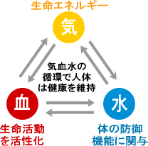 東洋医学では、病気の原因は、体内の成分を3つに分類する『気、血、水』によるものだとされます。